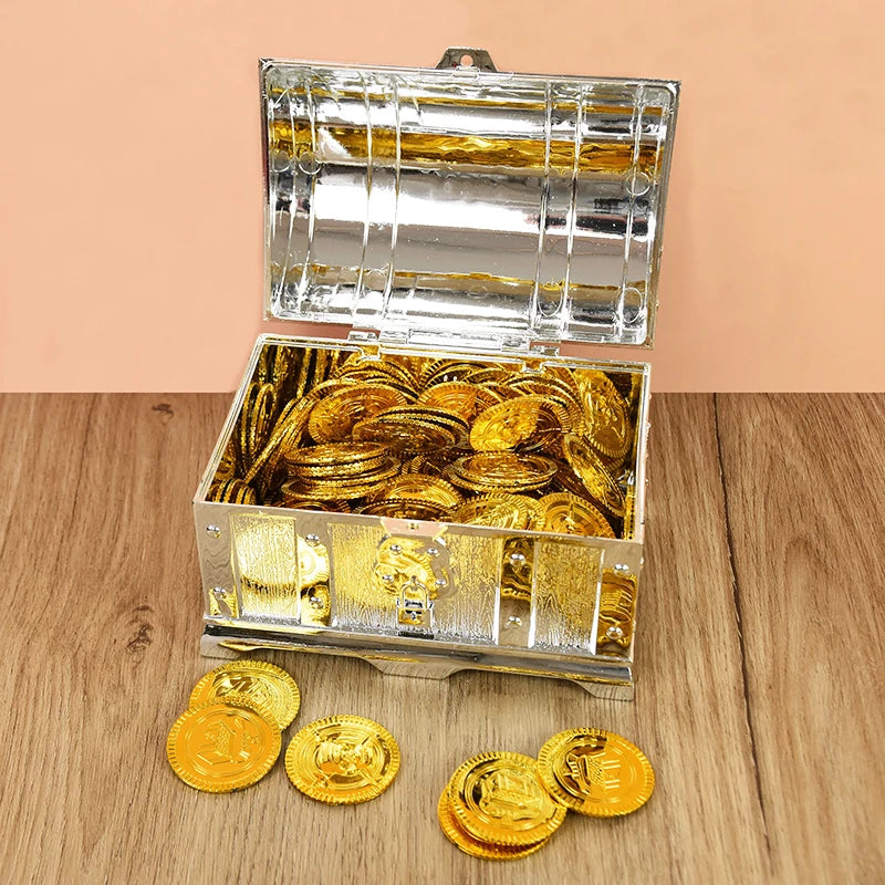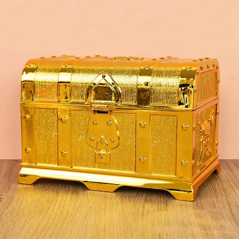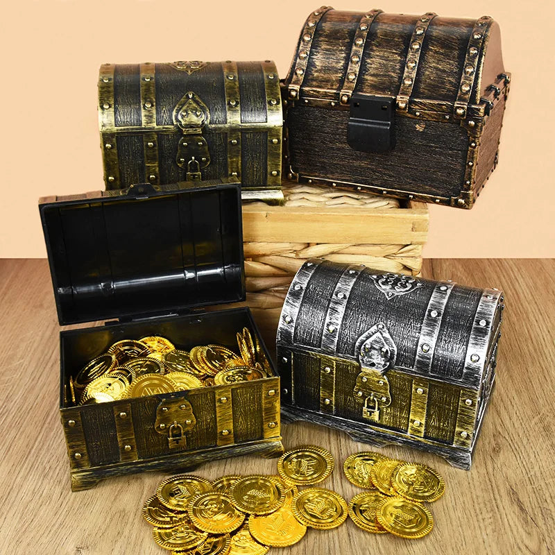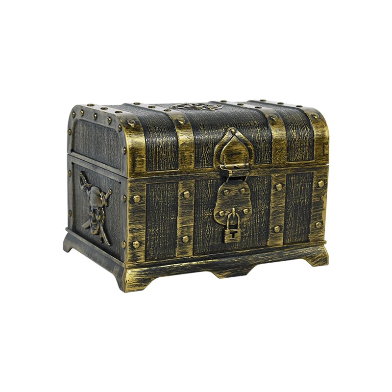 Diese Piratentruhe fuer Rollenspiele ist in Bronze-Gold gehalten und traegt an der Vorderseite ein praegnantes Totenkopf-Motiv - das klassische Piraten-Symbol. Der Klappdeckel mit Buegelverschluss macht die Truhe aus robustem Kunststoff kindersicher und mehrfach nutzbar. Die dunkle Holzstruktur-Optik kombiniert mit goldenen Beschlaegen und Nieten laesst sie wie eine echte Schatzkiste aussehen.