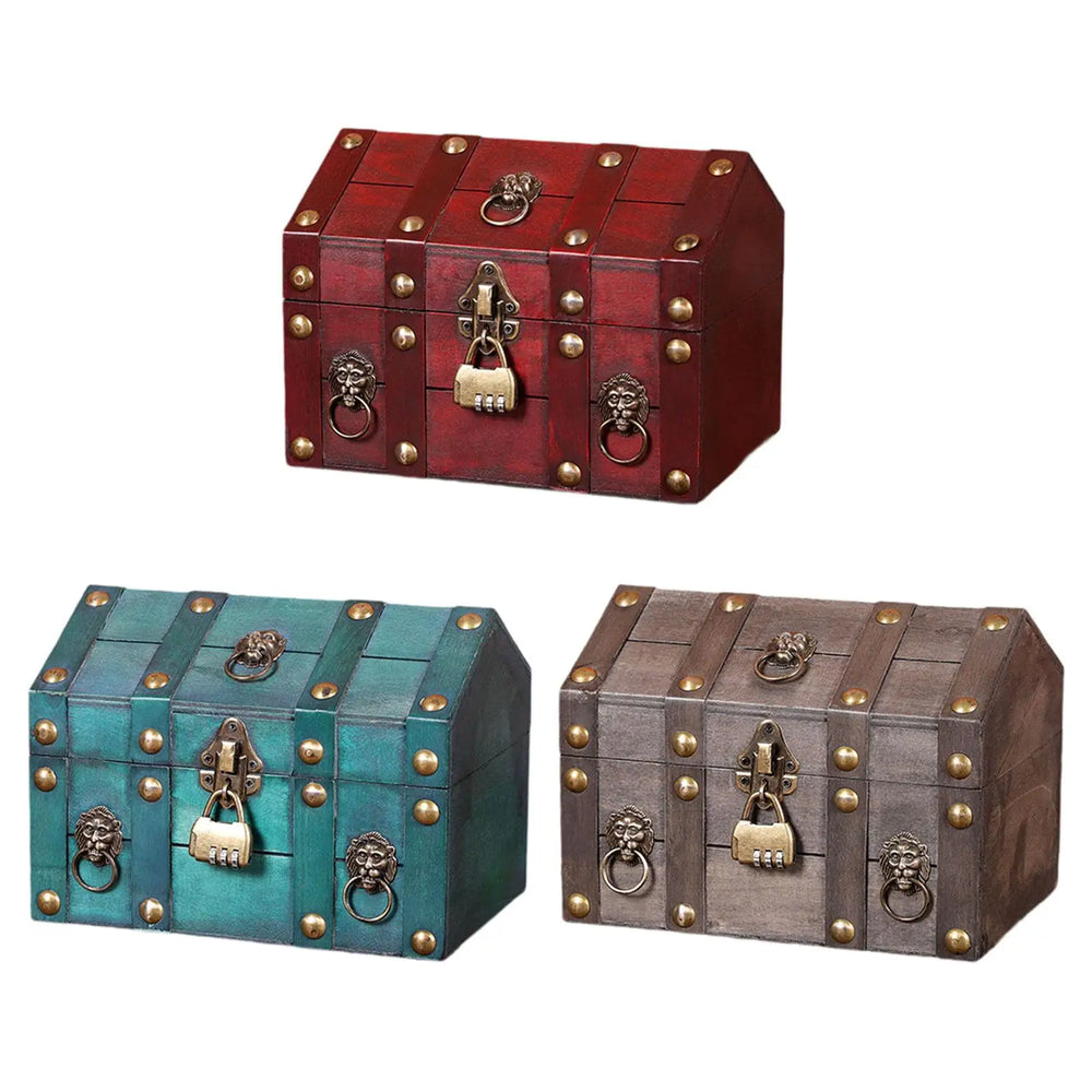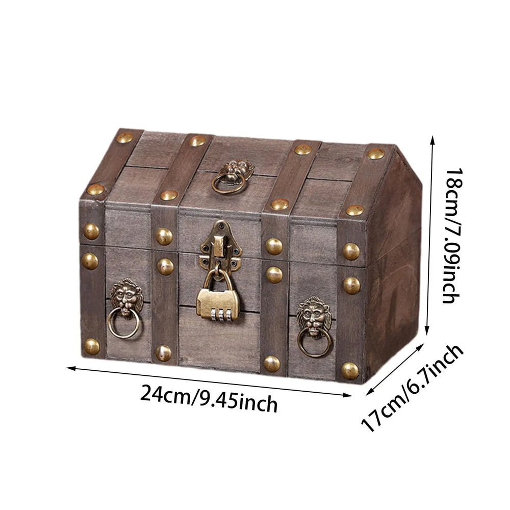 Diese Schatzkiste aus Piraten-Holz in leuchtendem Teal-Tuerkis zieht sofort Blicke auf sich. Das eingebaute Zahlenkombinationsschloss an der Vorderseite macht den Schatz wirklich unzugaenglich - nur wer den Code kennt, kommt rein. Dazu kommen dekorative Loewen-Grifffiguren an beiden Seiten und umlaufende Goldmetall-Nieten, die der Truhe eine edle Ausstrahlung verleihen.